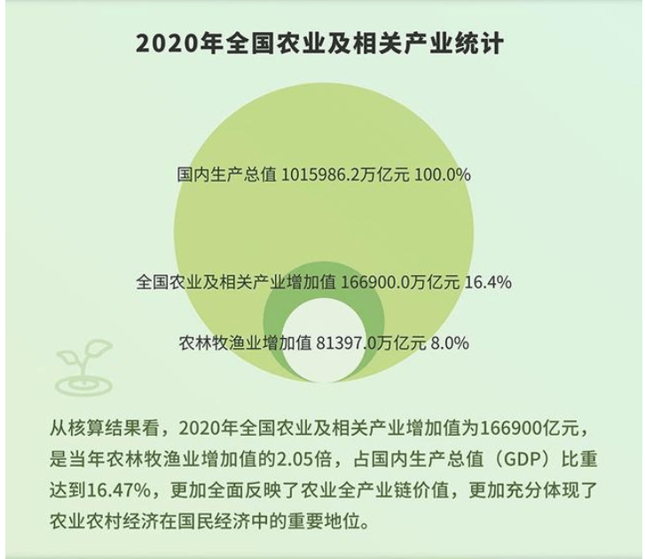 據(jù)國家統(tǒng)計局1月12日消息,2020年,全國農(nóng)業(yè)及相關(guān)產(chǎn)業(yè)增加值166900億元,占GDP比重為16.47%。農(nóng)業(yè)及相關(guān)產(chǎn)業(yè)增加值是農(nóng)林牧漁業(yè)增加值的2.05倍。